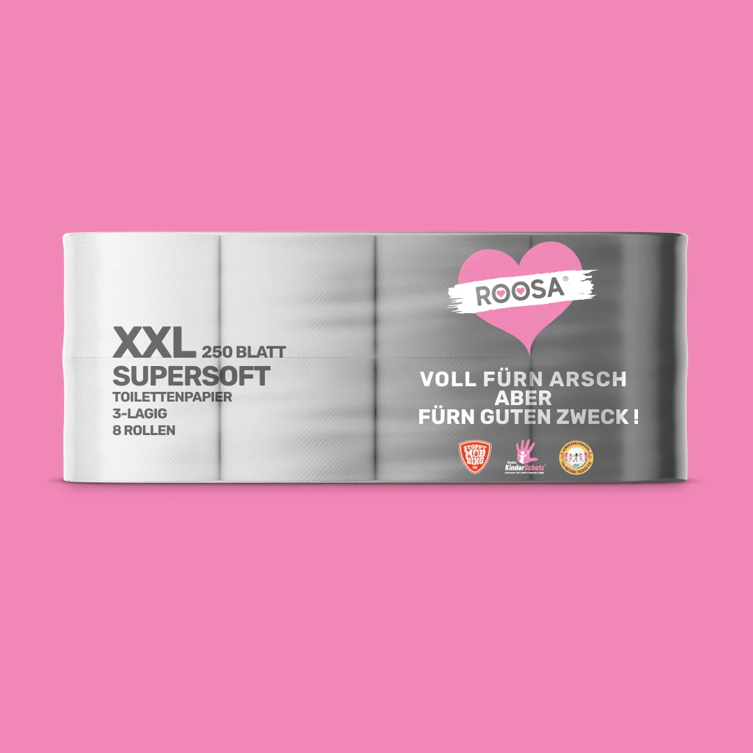 Mit jeder verkauften Packung ROOSA WC Papier unterstützt du das Bündnis Kinderschutz. Ein Teil des Erlöses fliesst direkt in wichtige präventive Projekte und Aufklärungsarbeit – gegen Mobbing, Gewalt, Hass und Vorurteile. Gemeinsam setzen wir uns für den Schutz von Kindern und Jugendlichen ein und fördern eine Gesellschaft, in der Respekt, Sicherheit und Menschlichkeit an erster Stelle stehen.